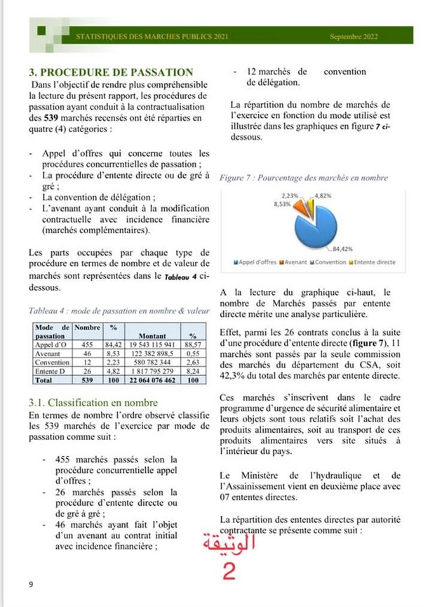 – أن سلطة تنظيم الصفقات تصدر تقارير مضللة – تحول منها نسخ لرئيس الجمهورية ورئيس البرلمان – لا تمت للشفافية بصلة، حيث ورد في تقريرها لسنة 2020 أن مجموع صفقات التراضي بلغت 20 مليارا في حين أنها زادت على 40 مليار (انظر الوثيقة: 1)، وأن مجموع صفقات التراضي لسنة 2021 كان 18 مليارا في حين أن صفقات التراضي في تلك السنة زادت على 100 مليارا (انظر الوثيقة: 2).