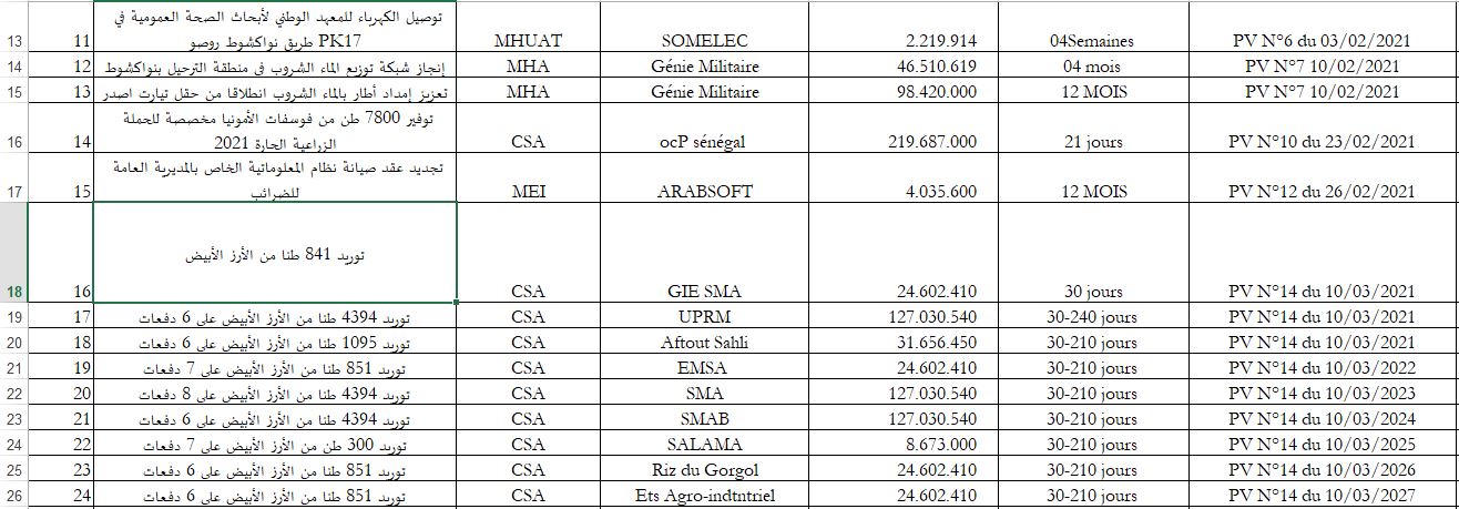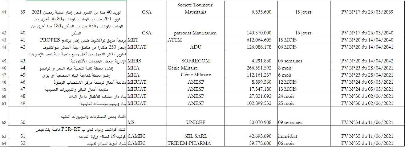 كما حصلت الوكالة الوطنية للدراسات ومتابعة المشاريع على أربع صفقات عبر التراضي، وكان سقفها المالي في حدود 1.5 مليار أوقية.
