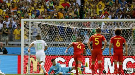 وسيطر منتخب بلجيكا على مجريات الشوط الأول ولكن بدون فاعلية هجومية، في المقابل اعتمد المنتخب الجزائري على الهجمات المرتدة السريعة التي تحصل من إحداها على ركلة جزاء سجل منها سفيان فيغولي الهدف الأول لمحاربي الصحراء في الدقيقة 25.