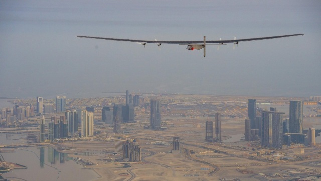 وأقلعت الطائرة من مطار البطين في أبو ظبي بقيادة الطيار السويسري أندريه بوش بيرغ، الذي قال إن الرحلة تهدف إلى تأكيد أن الإنسان قادر على خفض استهلاكه من الطاقة، وتأمين مصادر متجددة باستخدام تقنيات جديدة.