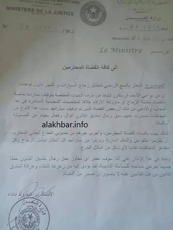 ودعا وزير العدل في تعميم صادر عنه حمل تاريخ 14-06-2017 وحصلت الأخبار على نسخة منه القضاة إلى إزالة أي تظليل لزجاج سياراتهم وكل مظاهر المخالفات وأن يلتزموا بالنظم والقوانين السارية تفاديا لأي شكل من أشكال الحرج.