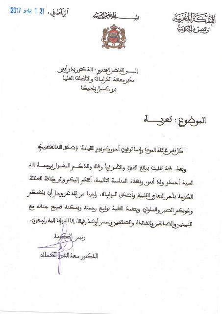 وحملت رسالة التعزية المرفقة تحت رأسية الحكومة المغربية توقيع د.العثماني، ويعود تاريخها إلى الثاني عشر من شهر يوليو الجاري.