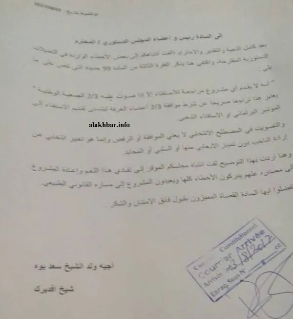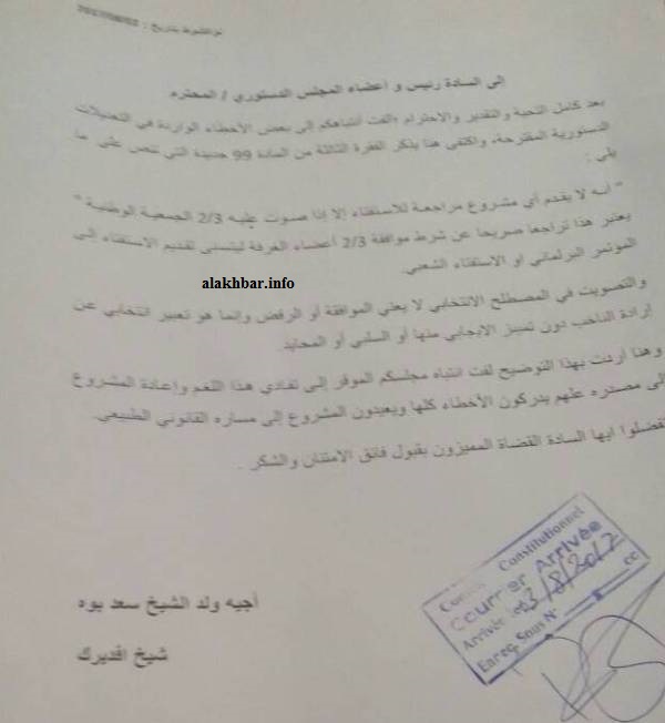 الأخبار (نواكشوط) ـ وجه شيخ مقاطعة أفديرك بولاية تيرس الزمور السيناتور اجيه ولد الشيخ سعد بوه رسالة إلى المجلس الدستوري يدعوه فيها تفادي “اللغم”، في إشارة إلى تنظيم الاستفتاء على تعديل الدستور.