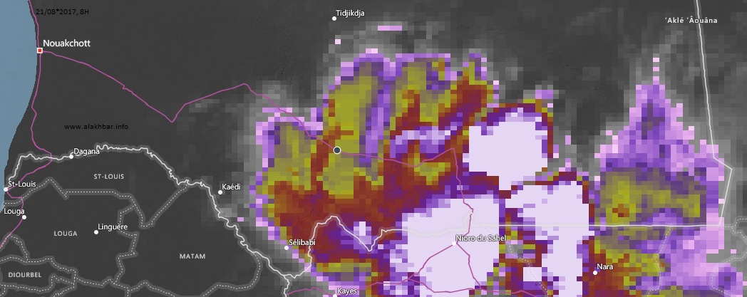 الأخبار (نواكشوط) – منذ فجر اليوم الإثنين 21 أغسطس الجاري تتواجد سحب ممطرة متوسطة الكثافة على جنوب الحوض الشرقي وجل الحوض الغربي، لعصابة وغيدى ماغة ويتوقع أن تؤدي إلى تساقط أمطار معتبرة وخاصة على الحوض الغربي ولعصابة بإذن الله تعالى.