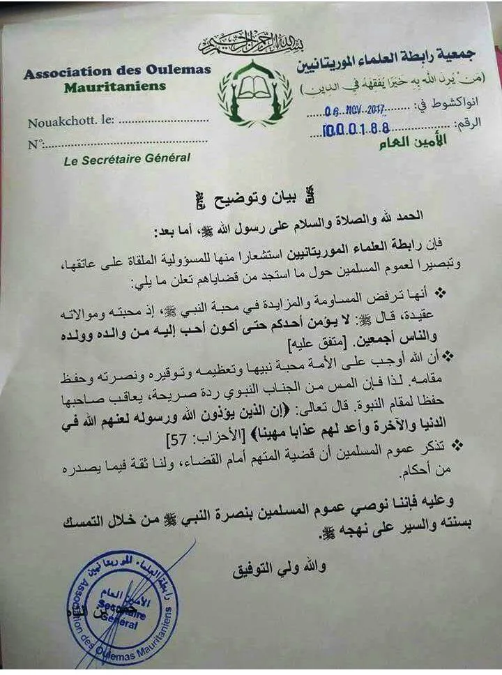 الأخبار (نواكشوط) – وصفت رابطة العلماء الموريتانيين المس من الجناب النبوي بأنه “ردة صريحة، يعاقب صاحبها حفظا لمقام النبوة”، مذكرة “عموم المسلمين أن قضية المتهم [كاتب المقال المسيء للنبي صلى الله عليه وسلم] أمام القضاء”، ومشددة على “ثقتها في ما يصدره من أحكام”.