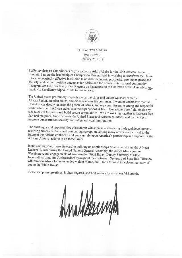 وأكد ترمب في رسالته للقادة الأفارقة أن الولايات المتحدة الأمريكية “تحترم الأفارقة كثيرا، وملتزمة بأن تظل العلاقات مع الدول الإفريقية متينة، وقائمة على الاحترام”.