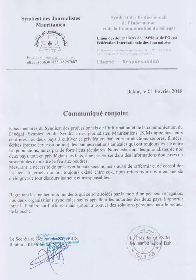 وحذر البيان المشترك الصادر عن نقابي الصحفيين الموريتانية والسنغالية من نشر المعلومات المغلوطة لما لها من تأثير على السلم الأهلي وروابط الشعبين.