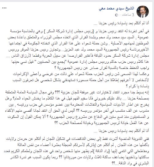 واعتبر ولد معي أن ولد محم في “في آخر تغريدة له انتقد.. وبشدة القرار الذي اتخذه مجلس الوزراء والمتعلق بإعادة بعض الموظفين لمهامهم الأصلية. وشن حملة شعواء على هذا القرار الذي اتخذته الحكومة في اجتماعها الأخير برئاسة رئيس الجمهورية السيد محمد ولد عبد العزيز… وتجاوز رئيس حزبنا الموقر ورئيس مجلس إدارة شركة السكر حدود اللباقة فأعتبر القرار صدا عن سبيل الحرية وقطعا لأرزاق الناس”، متسائلا: “هل نسي حينها واجب التحفظ خاصة بالنسبة لقرار صادر عن رئيس الجمهورية؟”.
