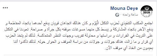 وأضافت بنت الدي في تدوينة نشرتها عقب اجتماع المكتب التنفيذي للحزب أن كلا الاتجاهين “يبسط مسوغات موقفه بكل جرأة وصراحة”، مردفة بقولها: “لذلك تأكدوا أننا بعيدون من اتخاذ أي موقف الآن”.