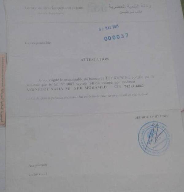 وأوضحت بنت آبكة أنها تسكن رفقة عيالها القطعة الأرضية منذ عام 2012، مشيرة إلى أن بعثة “لادي” عاينت المكان في 2013 وحددت معالم القطعة رقم 1007 بالقطاع SD في “السبيخة” بمقاطعة توجنين شرق نواكشوط وسجلتها باسمها ومنحتها إفادة بذلك.