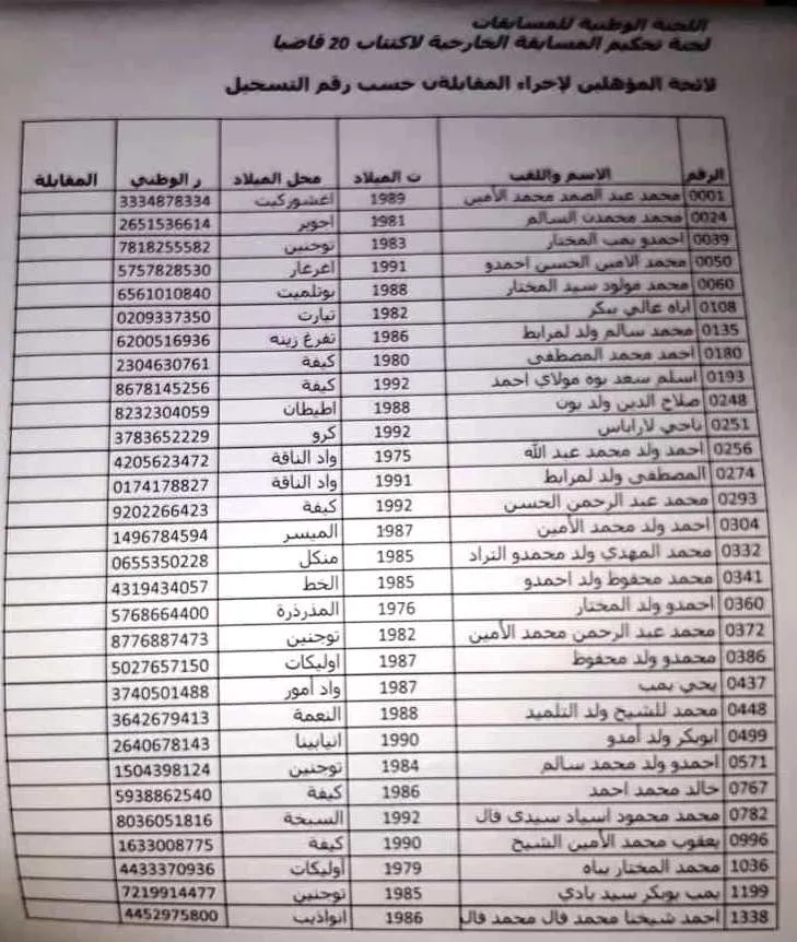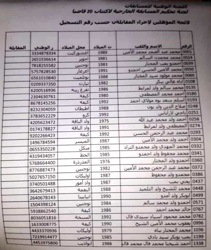 الأخبار (نواكشوط) – أعلنت اللجنة المشرفة على اكتتاب 20 قاضيا نتائج المسابقة الكتابية، حيث أعلنت اللجنة أسماء 30 فائزا، سيتم انتقاء 20 منهم بعد المقابلة شفهية، هي المرحلة المقبلة من المسابقة.