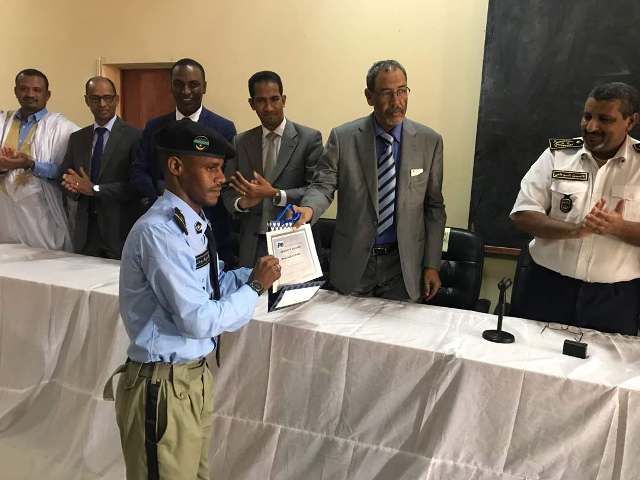 وسلم المدير العام المساعد للأمن المفوض الإقليمي محمد الأمين ولد أحمد شهادات التخرج على المتفوقين الأوائل، كما قدم تكريمًا لمدير مؤسسة “مترجمون محترفون” لمرابط عيسى باب.