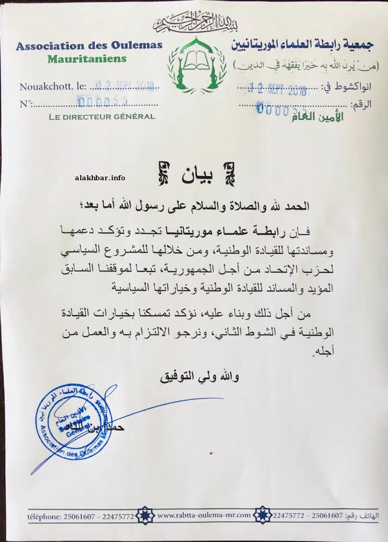 الأخبار (نواكشوط) – أكدت رابطة العلماء الموريتانيين دعمها ومساندتها للقيادة الوطنية، وللمشروع السياسي لحزب الاتحاد من أجل الجمهورية.