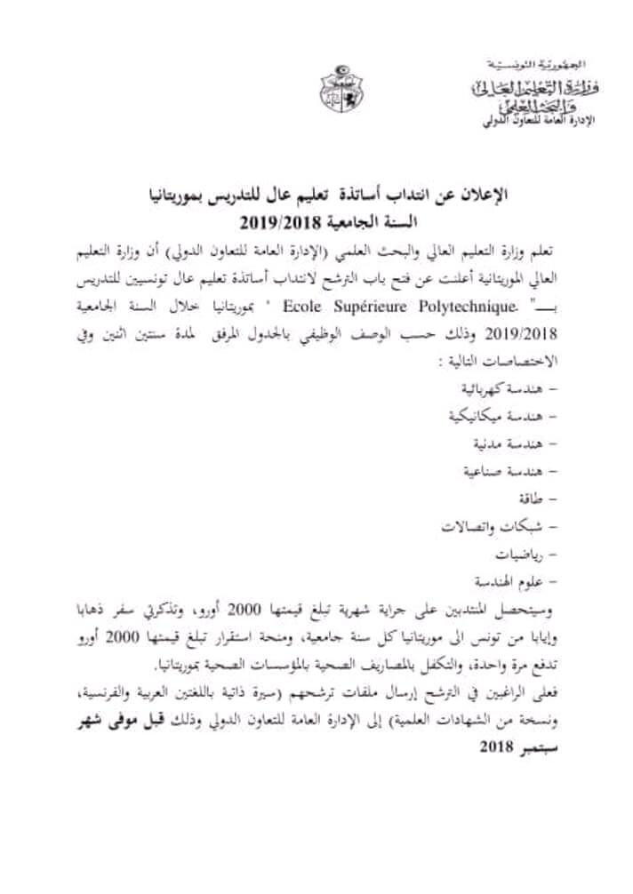 الأخبار (نواكشوط) – تقدمت وزارة التعليم العالي والبحث العلمي بموريتانيا لنظيرتها التونسية بطلب اكتتاب أساتذة للتدريس في المدرسة العليا متعددة التقنيات.