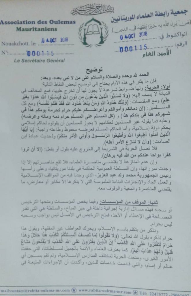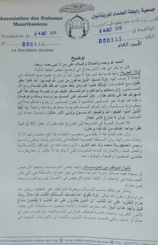 الأخبار (نواكشوط) – قالت رابطة العلماء الموريتانيين إن “منح الترخيص في الأصل ليس بواجب وسحبه ليس بحرام”، لافتة إلى أن منح الترخيص للمؤسسات أو سحبه “مسائل إدارية إجرائية داخلة في حيز المباح، والسلطة هي التي تقدر المصلحة في الإعطاء أو الأخذ”.