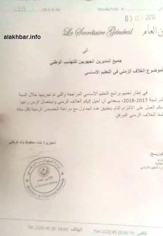 وجاء التعميم من الأمينة العامة لوزارة التهذيب الوطني الموجه إلى كافة المديرين الجهويين في الولايات فيما أحالته المديرة الجهوية إلى المفتش المقاطعي في المدينة.