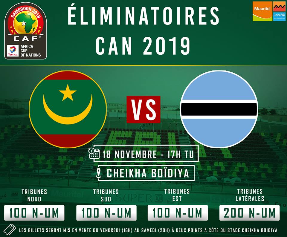 الأخبار (نواكشوط) أعلنت الاتحادية الموريتانية لكرة القدم بدء بيع تذاكر مباراة المنتخب الوطني مع بوتسوانا، اليوم الجمعة وغدا السبت في نقطتين أمام ملعب شيخا بيديا.