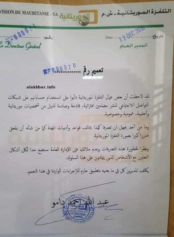 وصف المدير العام في التعميم الذي حصلت الأخبار على نسخة منه هذا التصرف بأنه “يخالف قواعد وأدبيات المهنة، كما أن من شأنه أن يلحق ضررا كبيرا بصورة التلفزة الموريتانية”.