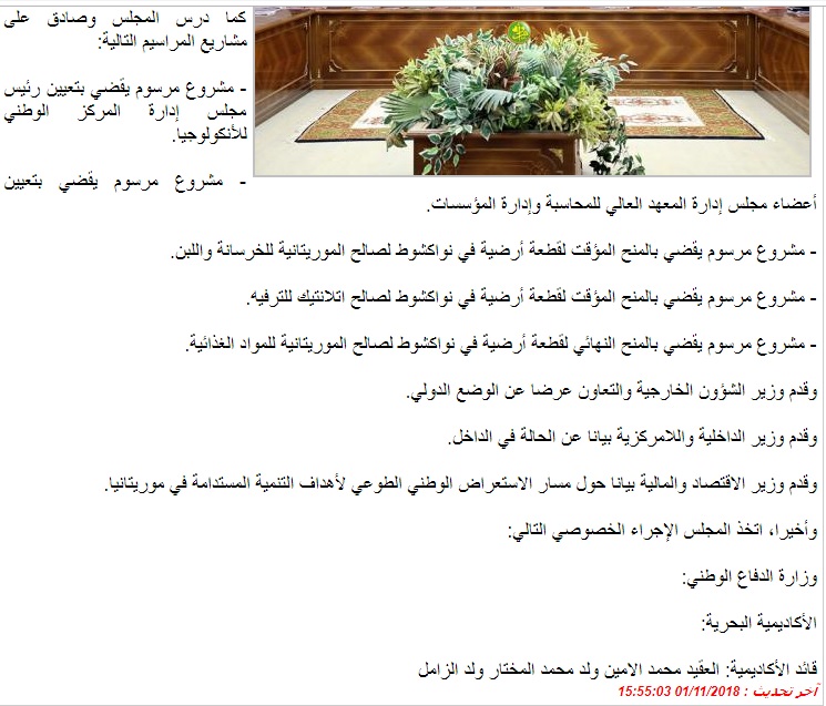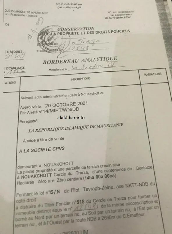 الأخبار (نواكشوط) ـ منحت الحكومة الموريتانية في اجتماعها المنعقد فاتح شهر نوفمبر الماضي قطعة أرضية خصوصية تحمل الرقم 12548 ومسجلة لدى إدارة العقارات باسم LA SOCIETE CPVS لصالح شركة الخرسانة واللبن.