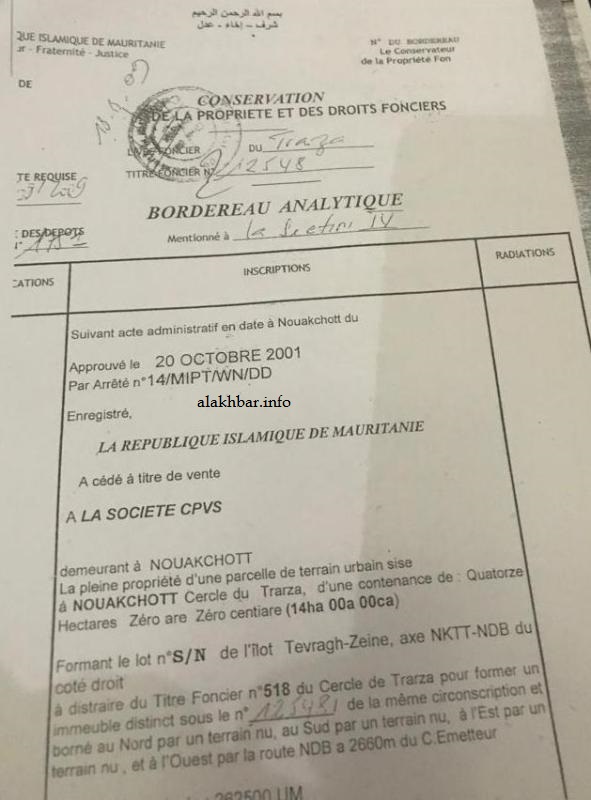 وقال ولد المصطفى إن ما حدث يعتبر سابقة في تاريخ البلد، مشددا على أنه لن يتنازل عن أرضه، ومستعرضا وثيقة موقعة من طرف المحافظ العقاري في 26 أغسطس 2016 تفيد أن قطعته الأرضية لا يوجد عليها رهن مسجل في السجلات العقارية.