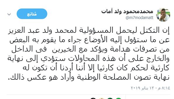 وقال ولد أمات في تغريدة على حسابه في اتويتر إن التكتل “يحمل المسؤولية لمحمد ولد عبد العزيز عن ما ستؤول إليه الأوضاع جراء ما يقوم به البعض من تصرفات هدامة”.