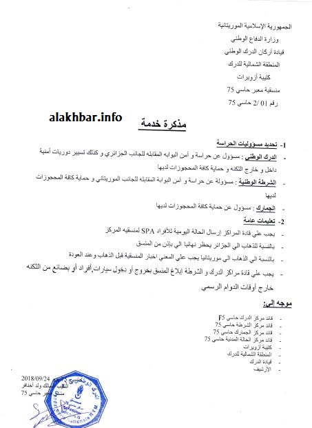 وتكشف مذكرة خدمة صادرة سبتمبر الماضي عن منسق المعبر النقيب الدركي السالك ولد اخنافر عن الإجراءات المتبعة داخل الثكنة، ومنها منع الذهاب إلى الجزائر نهائيا دون إذن مسبق من المنسق، كما يفرض إبلاغ المنسقية قبل الذهاب إلى موريتانيا أو العودة منها.
