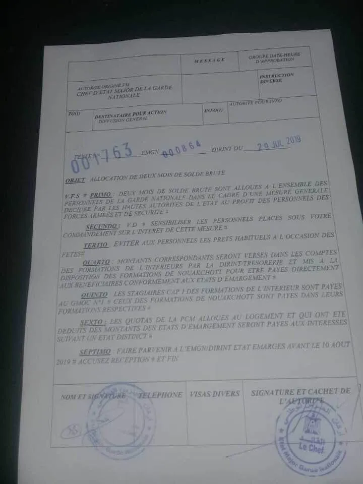 وأضاف التعميم أن رواتب هذين الشهرين، والذي تم لصالح جميع الأسلاك العسكرية، سيتم “وضعها في حسابات التشكيلات الداخلية، من طرف المصلحة المحاسبية، ووضعها تحت تصرف التشكيلات بنواكشوط، من أجل التسديد المباشر للمستفيدين”.