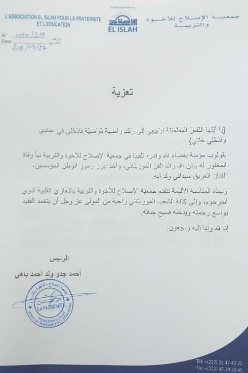 بقلوب مؤمنة بقضاء الله وقدره تلقينا في جمعية الإصلاح للأخوة والتربية نبأ وفاة المغفور له بإذن الله رائد الفن الموريتاني، وأحد أبرز رموز الوطن المؤسسين، الفنان العريق سيداتي ولد آبه.