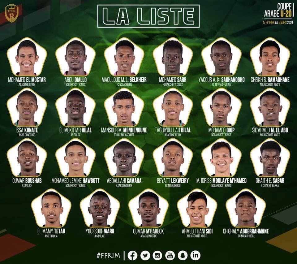 الأخبار (نواكشوط) أعلن مدرب المنتخب الموريتاني للشباب (تحت 20 عاماً) قائمة مكونة من 23 لاعباً لتمثيل موريتانيا في كأس العرب للشباب، التي سوف تحتضنها المملكة العربية السعودية في الفترة ما بين 17 فبراير الجاري و5 مارس المقبل.
