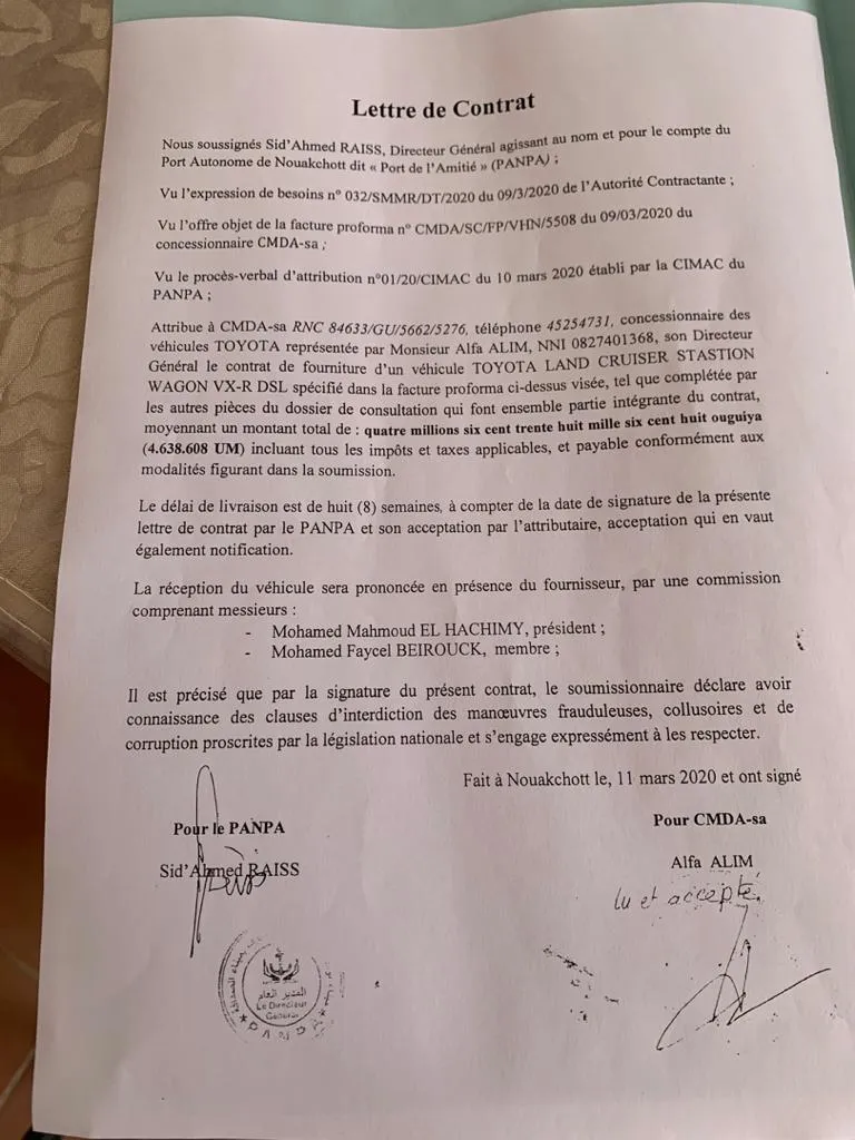 وأورد العقد مبلغ شراء السيارة وهو 4.638.608 أوقية فيما تجنب تحديد ما إذا كان المبلغ بالأوقية القديمة أو الجديدة.