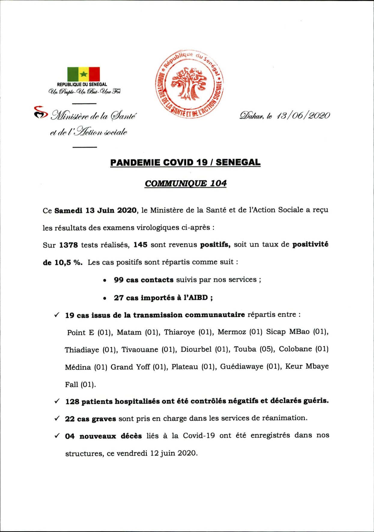 ووفق آخر بيان صادر عن وزارة الصحة والعمل الاجتماعي السنغالية، فقد سجلت 128 حالة شفاء جديدة، رفعت عدد المتعافين في البلاد إلى 3228.