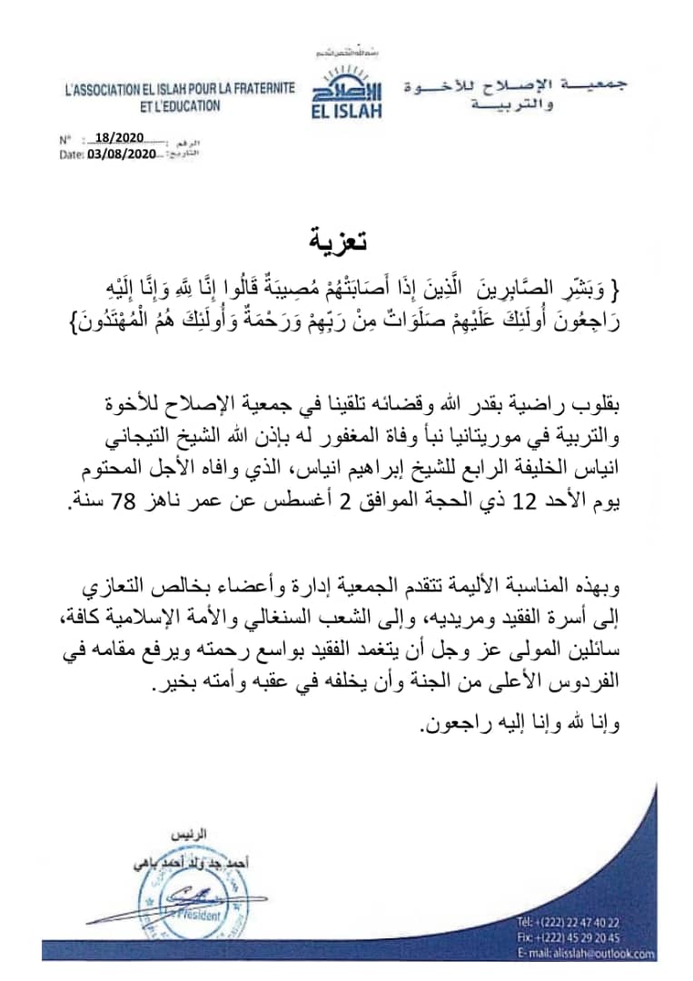 الأخبار (نواكشوط) – تقدمت جمعية الإصلاح للأخوة والتربية بالتعزية أسرة الشيخ التجاني انياس، ومريديه، وإلى الشعب السنغالي، والأمة الإسلامية كافة، بعد وفاته يوم الأحد الماضي.