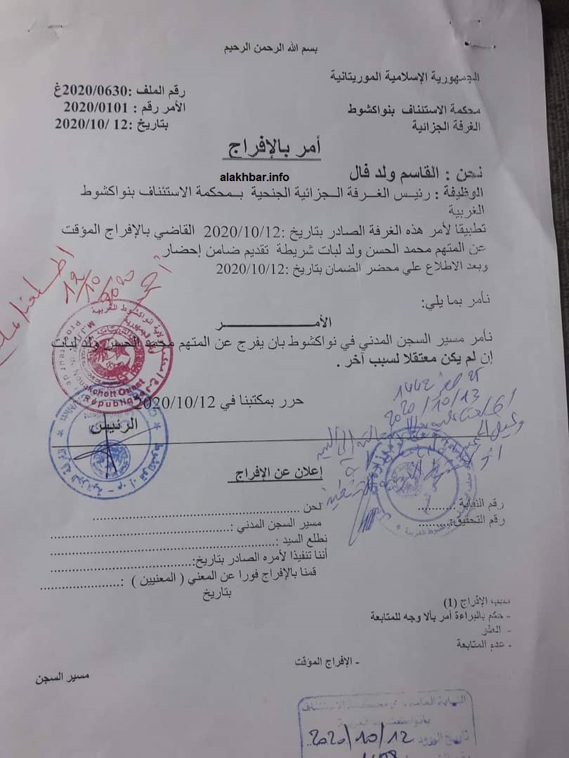 ووقع رئيس الغرفة القاضي القاسم ولد فال اليوم الاثنين أمرا لمسير السجن المدني بنواكشوط بالإفراج عن ولد لبات.