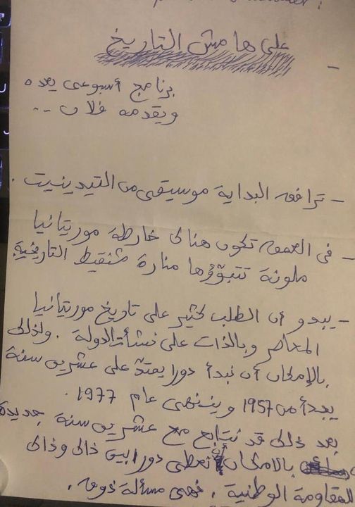 فجمعني آخر لقاء مع المرحوم بمنزله في لكصر، نهاية الأسبوع الماضي، رفقة الأستاذ داوود ولد أحمد عيشة الذي كان مواكبا لنا، مكلفا من طرفه بمتابعة تنفيذ التحضيرات النهائية لإطلاق البرنامج والترتيبات المصاحبة لذلك، فتحدثنا مليا حول ضرورة بدء تسجيل البرنامج وبثه في أسرع وقت ممكن، بعد أن نضجت الفكرة، واتضحت الرؤية، ولم يعد هناك مسوغ دافع لتأخير لحظة الميلاد، فأعطى المرحوم موافقته، وقدم لنا تصوره النهائي عن كيفية إعداد وإخراج البرنامج، وغُصنا معا في تفاصيل العقد الذي سيربطه بقناة الموريتانية لإعداد وتقديم البرنامج (على هامش التاريخ)، الذي اختار اسمه، وقدم تصورا أوليا عن الجنريك المقدِم له، والخلفية المصاحبة (الصورة المرفقة وثيقة بخط المرحوم يقدم فيها تصوره للبرنامج).