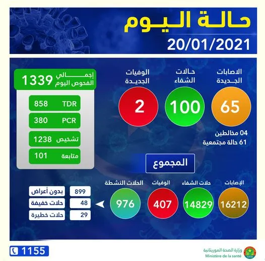 الأخبار (نواكشوط) – أعلنت وزارة الصحة الموريتانية مساء اليوم الأربعاء تسجيل حالتي وفاة جراء فيروس كورونا المستجد، إضافة لـ65 إصابة جديدة، و100 حالة شفاء، وذلك خلال الأربع وعشرين ساعة الأخيرة.