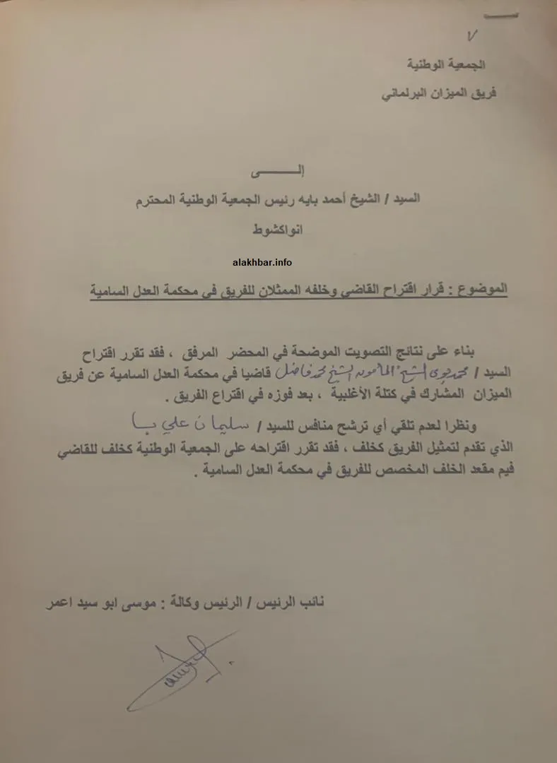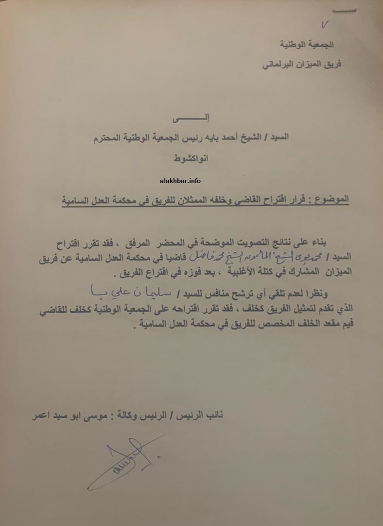وأرسل الفريق رسالة لرئيس الجمعية الوطنية الشيخ ولد بايه، قال فيها إنه اقترح النائب محمد بوي لعضوية محكمة العدل السامية بناء على تصويت أجراه اليوم الخميس، مؤكدا أن ولد الشيخ محمد فاضل فاز في الاقتراع.
