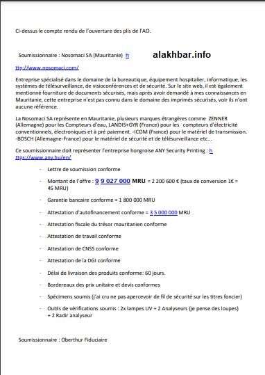 4. الشركة الموريتانية: NOSOMACI SA، وقدمت عرضا بسعر يبلغ 99.027.000 أوقية جديدة (2.200.600 يورو)، وفترة 60 يوما.