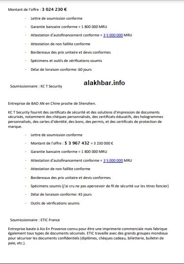 2. الشركة الهنغارية : Oberhur Fiduciare، وقدمت عرضا بسعر يبلغ 3.024.230 يورو، وفترة 60 يوما.