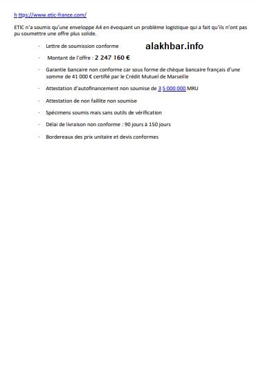 3. الشركة الفرنسية : ATIC-FRANCE، وقدمت عرضا بسعر يبلغ: 2.247.160 يورو، وفترة من 90 إلى 150 يوما.