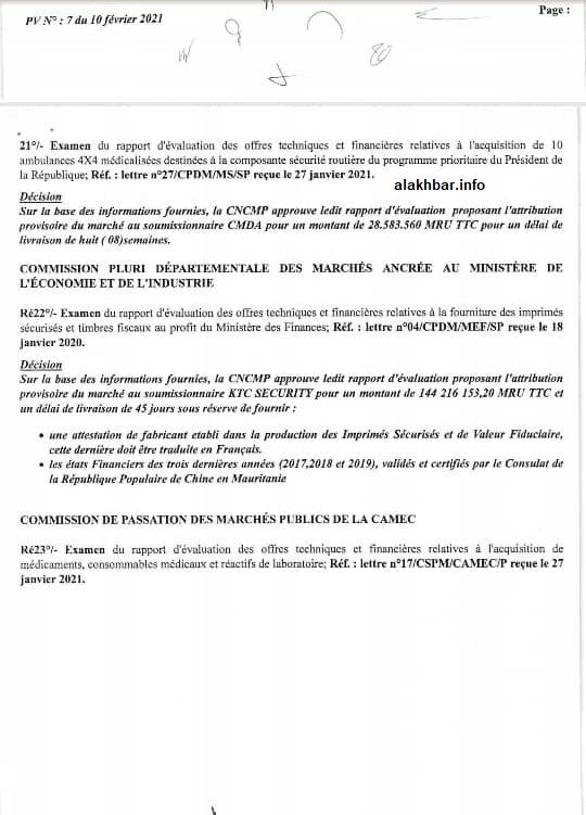 الأخبار (نواكشوط) – أجازت اللجنة الوطنية لرقابة الصفقات العمومية في موريتانيا تقرير منح صفقة للشركة الصينية KC T Security، بقيمة 1.4 مليار أوقية قديمة (3.9 مليون دولار)، كان سعرها هو الأغلى من بين العروض المالية التي تقدمت للصفقة، كما كشف محضر اللجنة أن الشركة لا تتوفر على الشروط الفنية المطلوبة، وطالبها بتوفيرها.