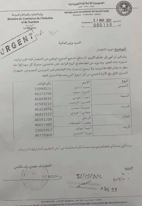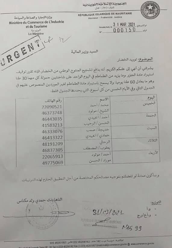 الأخبار (نواكشوط) ـ قررت وزارة التجارة والسياحة وقف استيراد مادة الجزر والسماح باستيراد حمولة شاحنتين فقط يوميا من مادة الطماطم حمولة كل منهما 30 طنا.