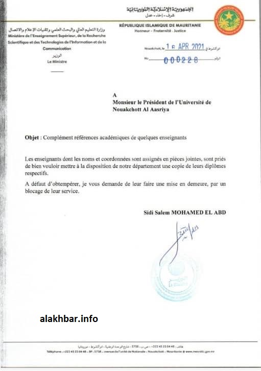 الأخبار (نواكشوط) وجه وزير التعليم العالي سيدي ولد سالم، رسالة لـ59 من الأساتذة الجامعيين في مؤسسات التعليم العالي، دعاهم فيها لإحضار نسخ من شهاداتهم الأخيرة.