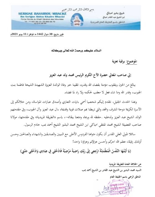 وجه الخليفة العام للطريقة المريدية شيخ بشير امباكي ابن الشيخ عبد القادر امباكي، برقية تعزية للرئيس السابق محمد ولد عبد العزيز إثر وفاة والدته.