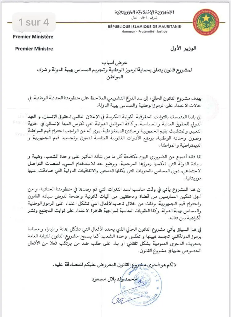 الأخبار (نواكشوط) – أحالت الحكومة الموريتانية إلى البرلمان مشروع قانون يتعلق بحماية الرموز الوطنية وتجريم المساس بهيبة الدولة وشرف المواطن، وذلك بعد أيام من المصادقة عليه في مجلس الوزراء.