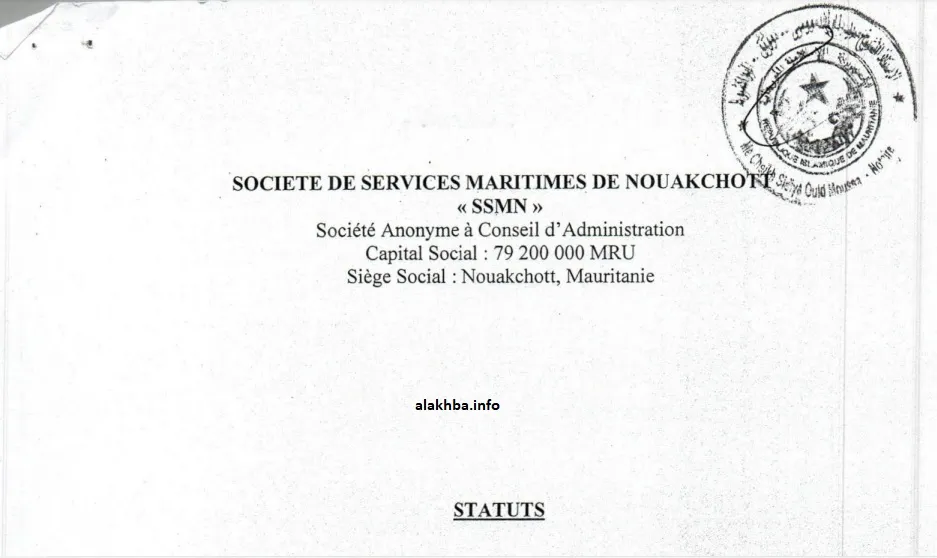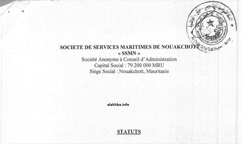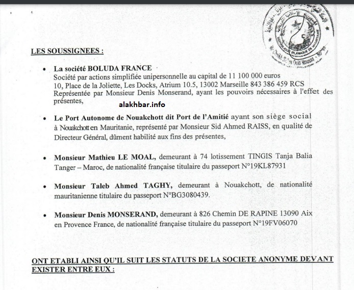 وينص النظام الأساسي للشركة، والذي وقعه ماتيي لموال، والطالب أحمد التقي، إضافة للمدير التنفيذي لشركة “بولودا فرنسا” دنيس مونسراه، والمدير العام لميناء نواكشوط المستقل سيدي أحمد ولد الرايس على إنشاء شركة “خفية الاسم، مسجلة في موريتانيا وتخضع للقوانين المعمول بها في الجمهورية الإسلامية الموريتانية وكذلك لهذا القانون الأساسي”.