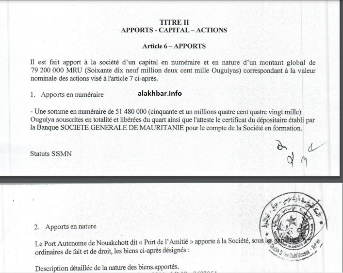 ومع أن الإعلان الرسمي تم بناء على اتفاق مع شركة فرنسية، إلا أن النظام الأساسي للشركة، والذي حصلت وكالة الأخبار على نسخة منه يظهر وجود موريتاني إلى جانب الفرنسيين المؤسسين، وهو أحد موظفي الميناء منذ 1992.
