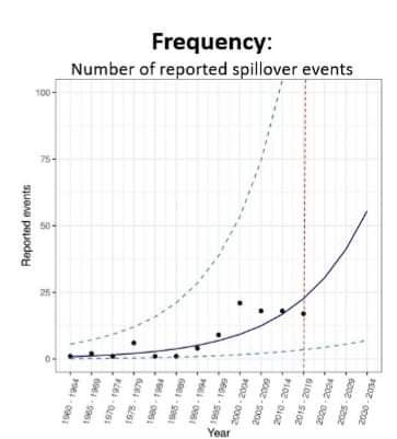 كل تلك الظواهر والاختلالات تؤكد بأن كوفيد -19 ليس الوباء الوحيد في السنوات القادمة؛ إنما هو بداية لقرع طبول الأحداث الوبائية. وإستناداً إلى تحليل البيانات التاريخية حول تواتر وتفشي الأوبئة وتوزيعها الجغرافي، يظهر أن تواتر وشدة انتشار الأمراض المعدية مباشرة من مضيفها أو خزانها الحيواني المنشأ إلى البشر يتزايد باضطراد. كما يوضح الرسم البياني المرفق هذا الاتجاه.