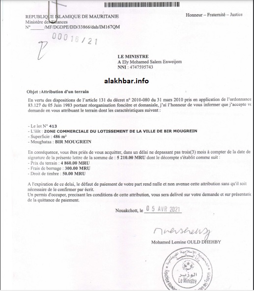 وكشفت هذه الوثائق أن الوزير ولد الذهبي منح 37 قطعة أرضية في مدينة بير أم اكرين بولاية تيرس الزمور، تقع على مساحة إجمالية قدرها 41990 مترا مربعا، وذلك لصالح عدد من النافذين.