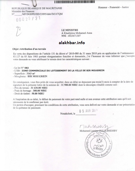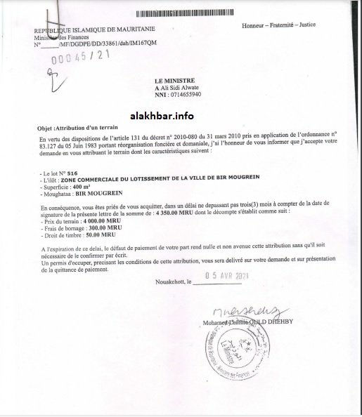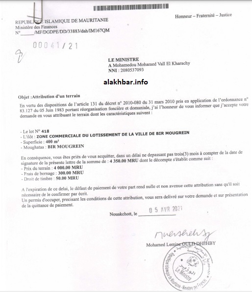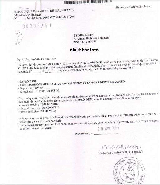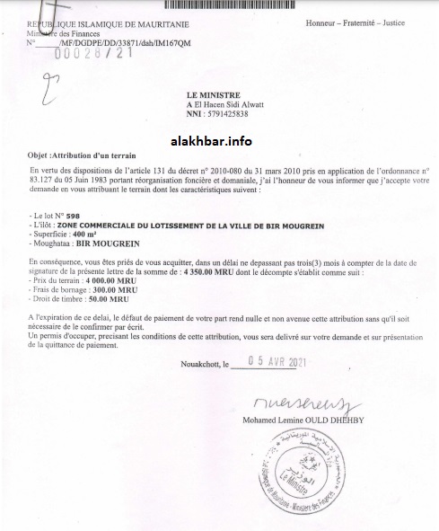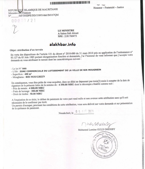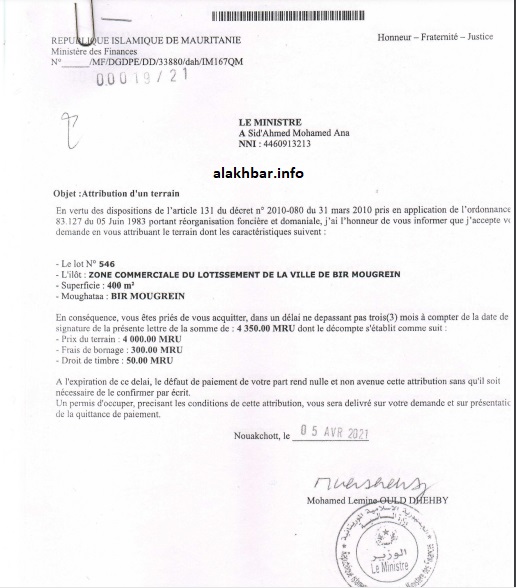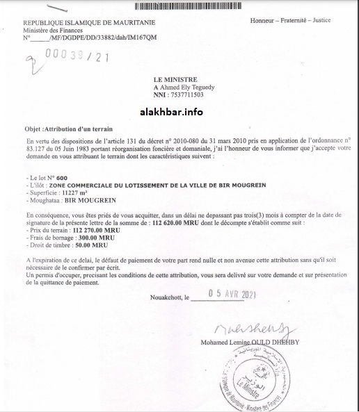 الأخبار (نواكشوط) – حصلت وكالة الأخبار على وثائق تحمل توقيع وزير المالية محمد الأمين ولد الذهبي تم بموجبها منح عشرات القطع الأرضية في منطقة تجارية، وبأسعار رمزية، رغم أن بعضها يتجاوز الحد المسموح للوزير قانونيا بمنحه، وهو 1000 متر مربع.