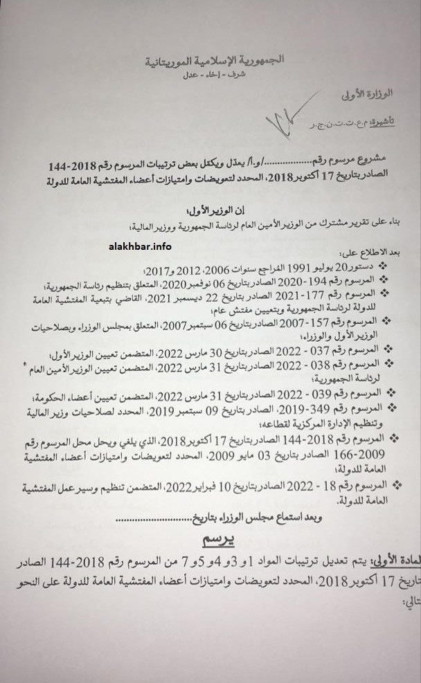 الأخبار (نواكشوط) – حصلت وكالة الأخبار المستقلة على المرسوم الذي أجازته الحكومة خلال اجتماعها الأربعاء، والذي يمنح امتيازات جديدة لأعضاء المفتشية العامة للدولة عقب تحويل تبعيتها من الوزارة الأولى إلى الرئاسة.